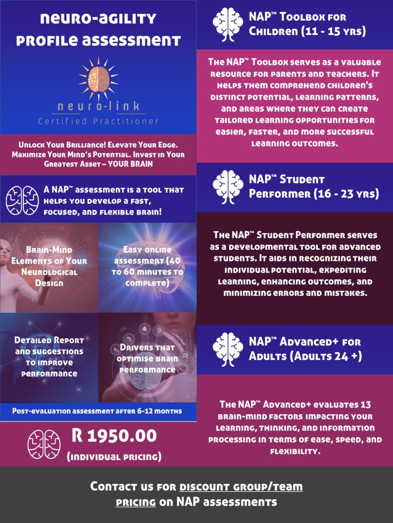 A Neuro Agility Profile (NAP) is like a brain fitness test. It shows how fast and flexible your brain is when learning, thinking, and solving problems.